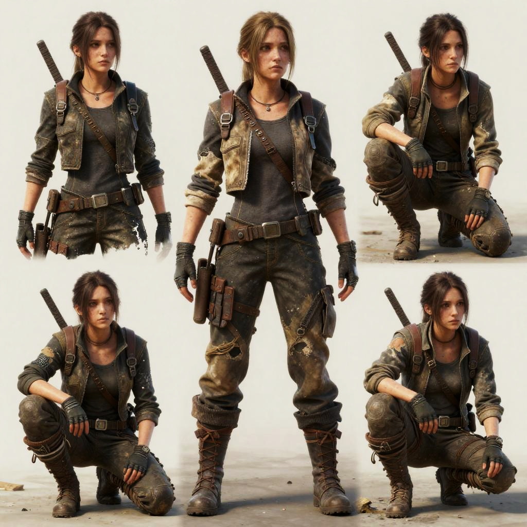 Character sheet poses for a post-apocalyptic survivor, various combat and resting stances, rugged outfit with worn textures, muted earth tones, realistic and gritty style with fine detailing.