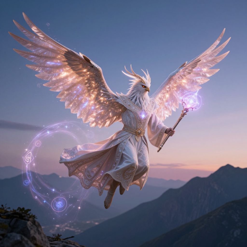 DnD owlin wizard mid-flight casting a grand spell, wings spread wide shimmering with magical energy, wearing elegant embroidered robes that ripple with enchantments, ethereal runes trailing from the staff tip, over a mystical mountain range at twilight.