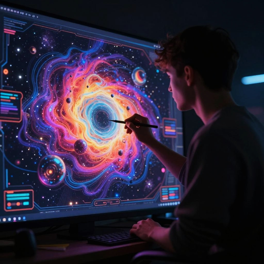 Digital art free theme featuring an artist in a bright studio painting on a transparent digital canvas filled with glowing neon colors and floating geometric figures, symbolizing limitless creativity and the freedom of digital expression.