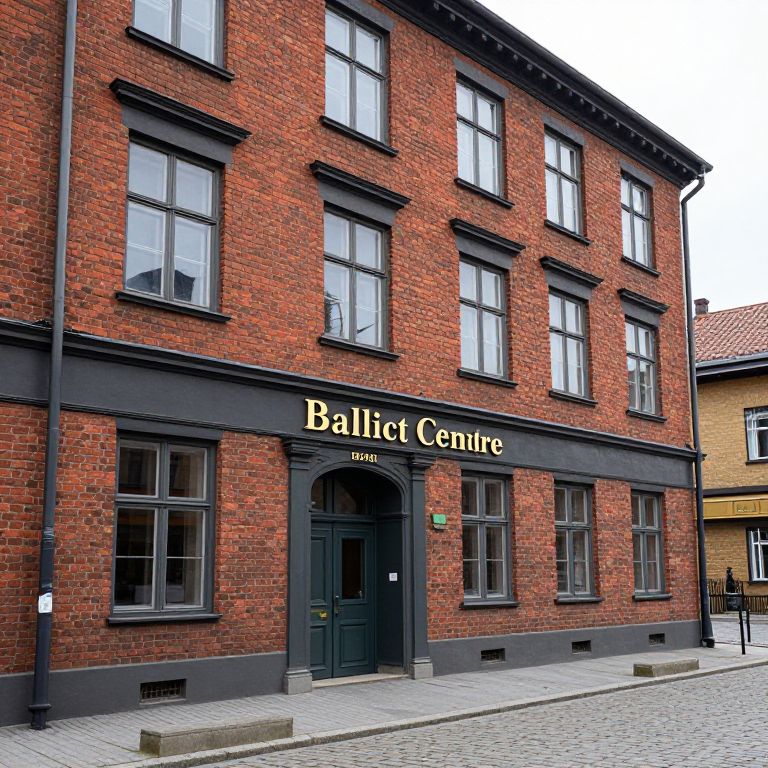 Photograph of a three-story red brick building with black window frames and trim. The ground floor features a black door with an arched top, above which the building's name, "Ballet Centre," is displayed in white, uppercase letters. The building has symmetrical windows on each floor, with the ground floor windows slightly recessed. A cobblestone sidewalk leads up to the door, with a small, square concrete block at the edge. The background includes a yellow building with a red-tiled roof partially visible on the right. The sky is overcast, casting a soft light on the scene.