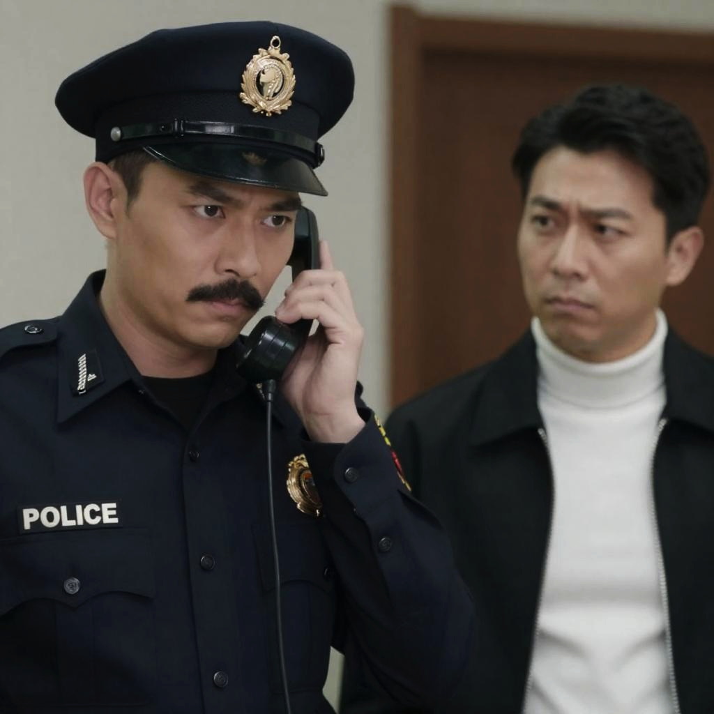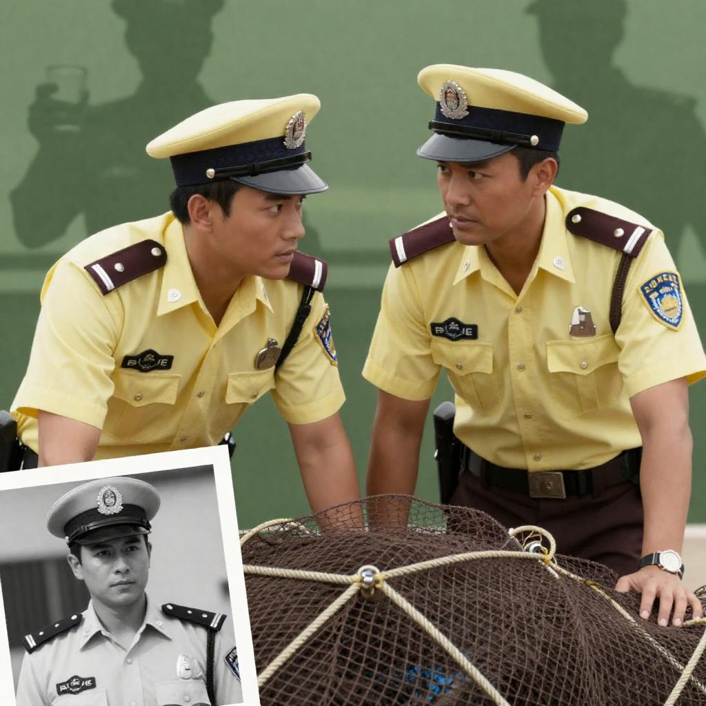 Two male police officers in beige uniforms and caps, standing on a rusty industrial staircase. One holds a clipboard, the other crosses his arms. Both look at each other with serious expressions. Sunlight illuminates the scene.