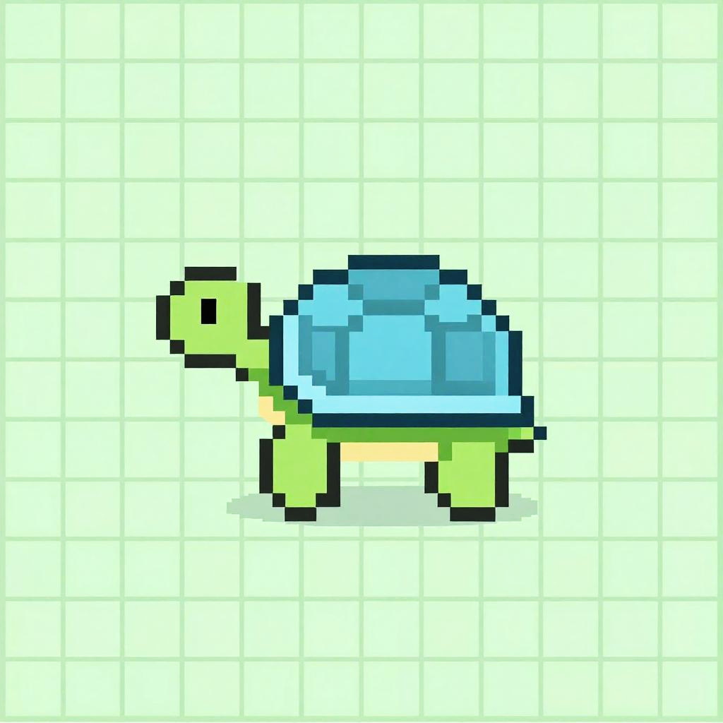 Pixel art turtle designed as a spreadsheet character, each cell representing a pixel in the turtle’s shell, walking on a grid of spreadsheet cells, minimalistic pixel style with shades of green and blue, playful and colorful digital art.