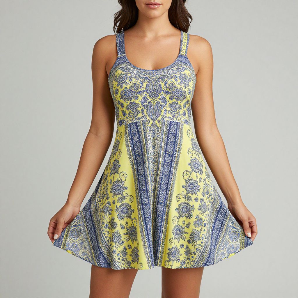 "Woman, summer clothing, sleeveless A-line mini dress with a blend of yellow and blue intricate paisley patterns, scoop neckline, flared skirt, thin straps, casual and breezy fabric.. Sexy. Pretty face and beаutiful eyes. Big breasts."