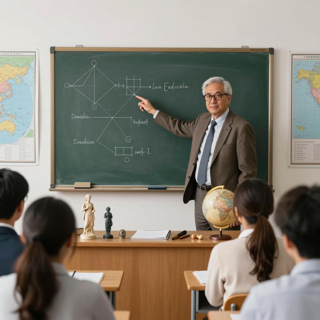 Photograph of a male professor in a brown suit and glasses, standing in a classroom, pointing at a chalkboard with diagrams. Desk behind him has various ancient artifacts, including statues, globes, and tools. Several students in foreground, blurred. Professor's expression is focused. Classroom has maps on the walls.