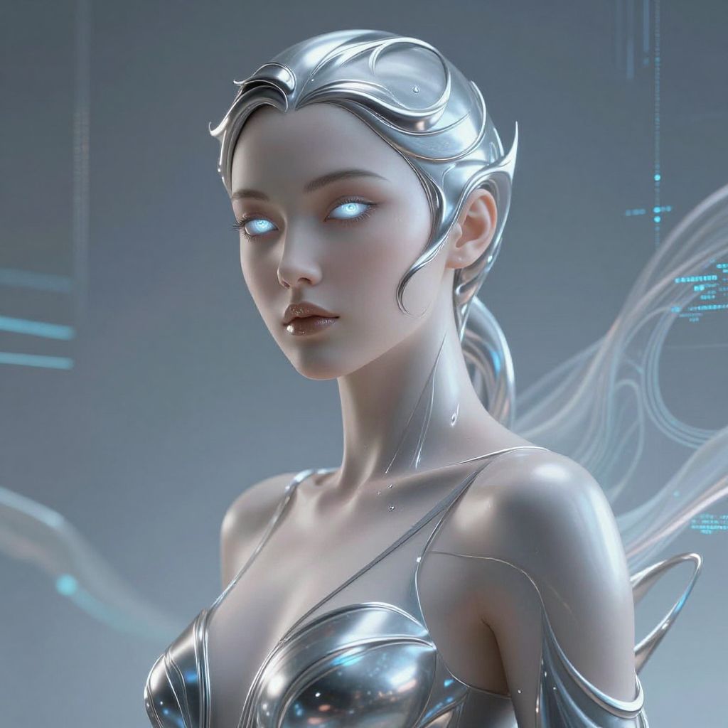 Digital CGI image of a futuristic, ethereal woman with silver, metallic hair and glowing blue eyes. Her skin is pale, and she wears a sleek, reflective, metallic armor that covers her shoulders and upper chest, with intricate, glowing lines. Her expression is calm and composed. The background is a gradient of blue and gray with abstract, glowing circuit-like patterns. The image has a high-tech, sci-fi aesthetic, with a focus on metallic textures and luminescent details. The woman's hair is styled in elegant, flowing waves.