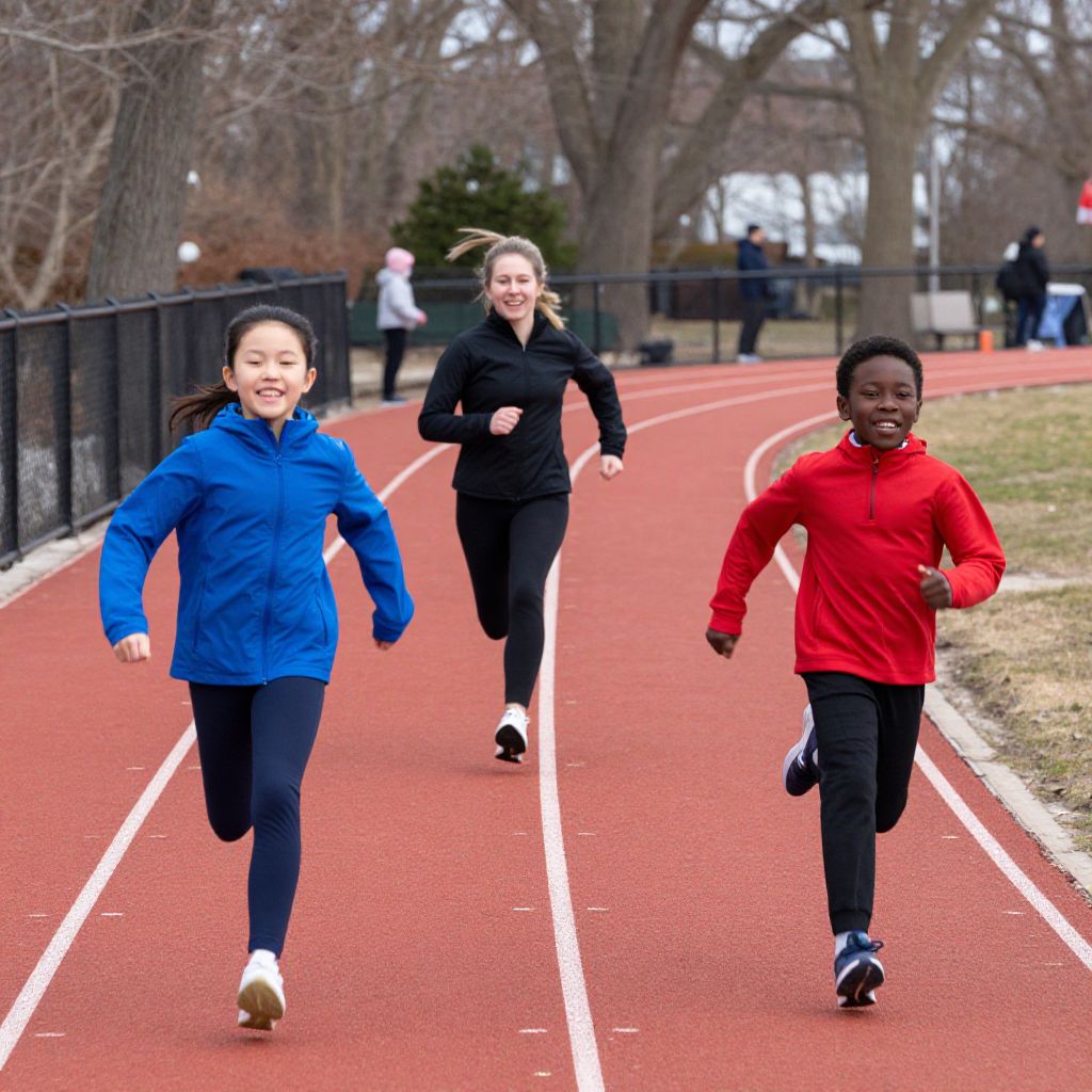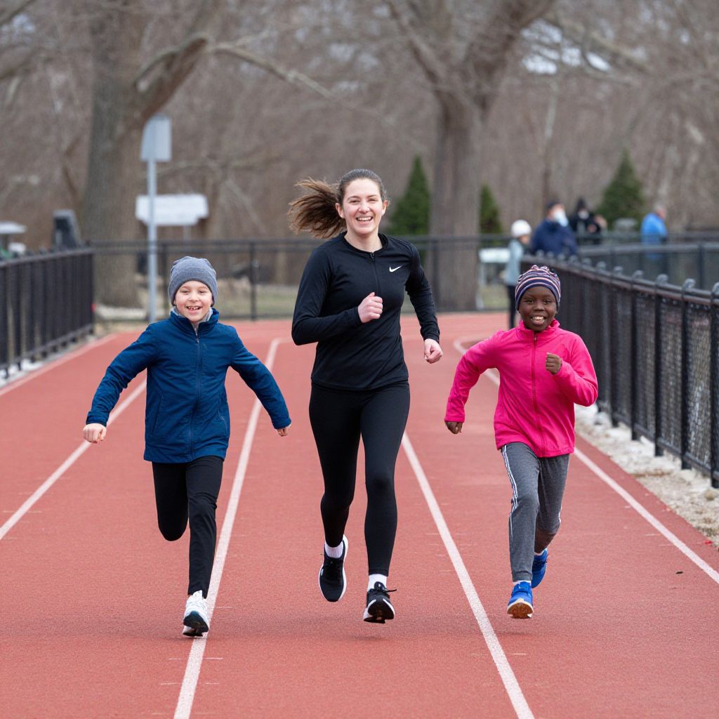 Woman and two children sprint joyfully along a vibrant red running track, their smiles radiating energy as they race together on a crisp winter day at Linden Park in the East New York neighborhood of Brooklyn, New York, on Sunday, Jan. 17, 2021.