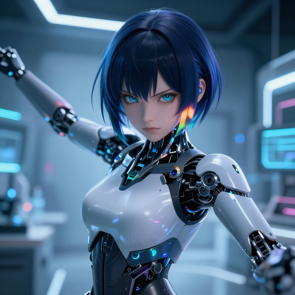 Anime cyborg girl with sleek metallic limbs and glowing blue eyes, futuristic cityscape background, vibrant neon colors, dynamic pose, high detail, cyberpunk aesthetic