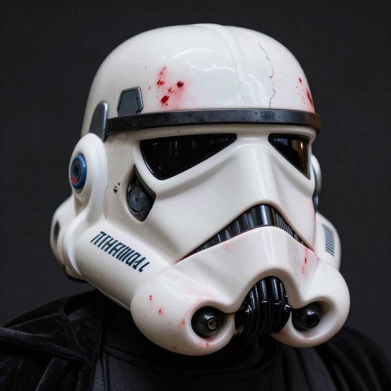 A photo-realistic stormtrooper helmet with bloodstains and cracks, resembling a vampire.