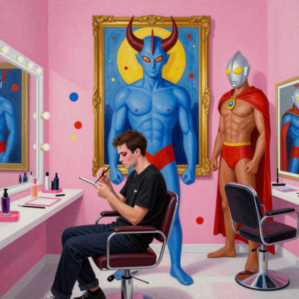Photograph-like digital art: A pink-walled room with a vanity mirror and lights. A young man with curly brown hair, wearing a black shirt and black pants, sits in a chair, applying makeup. Behind him, a blue, muscular demon with red horns and a yellow sun-like background stands. To the right, a silver-masked, muscular superhero in red underwear and a red cape stands. The vanity has makeup items, and a chair is positioned in front of it. The artwork features vibrant colors and exaggerated, comic-book style characters.