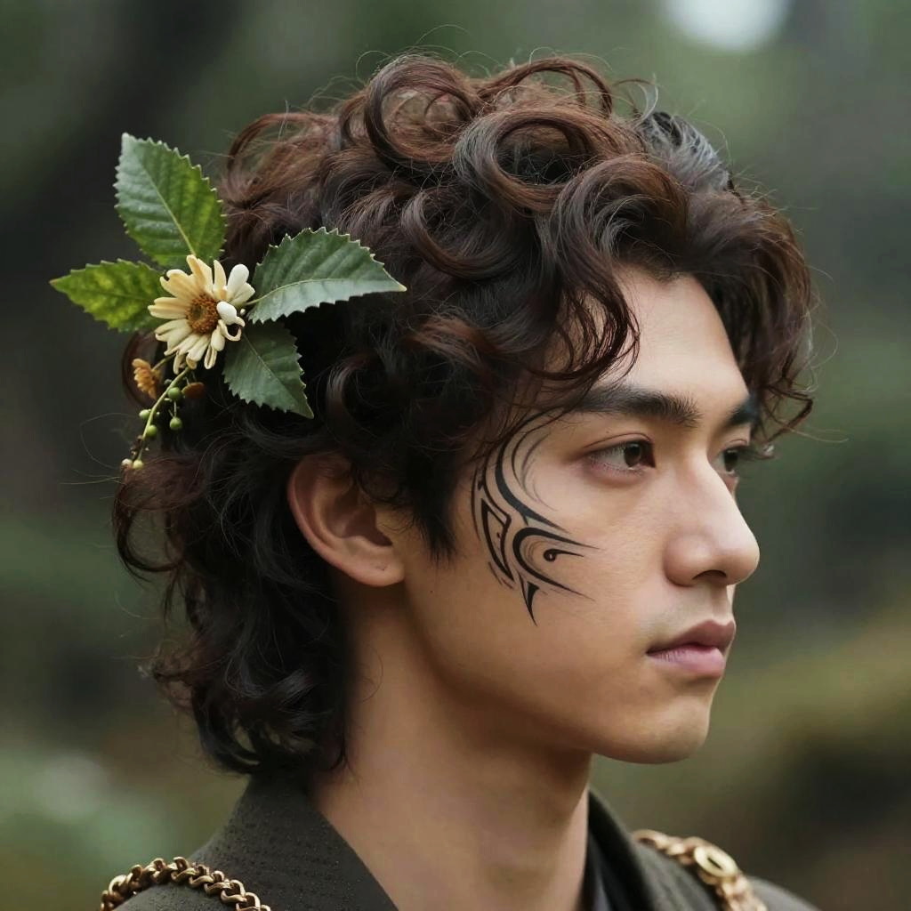 Fantasy male hairstyles showcasing elegant curls and tribal patterns, integrated with natural elements like leaves and flowers, immersed in a surreal dreamscape.