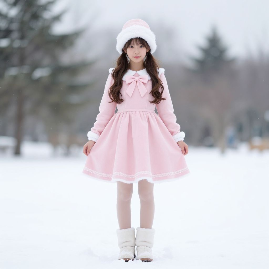 Photograph of a young Asian girl with long black hair, standing in a snowy landscape. She wears a light pink, long-sleeved dress with a white bow at the chest, a white fur hat, and white snow boots. The dress has a flared skirt with a white trim. The background is blurred, featuring snow-covered trees and a gray, overcast sky. The girl's expression is neutral, and she stands with her arms slightly out to her sides. The overall color palette is soft and pastel, contrasting with the white snow.