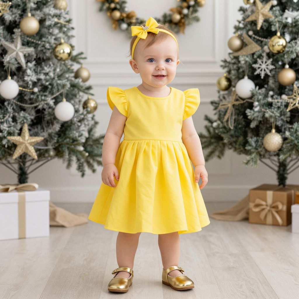Baby Party Costume, dressed in a yellow dress and gold shoes standing in front of christmas decorations