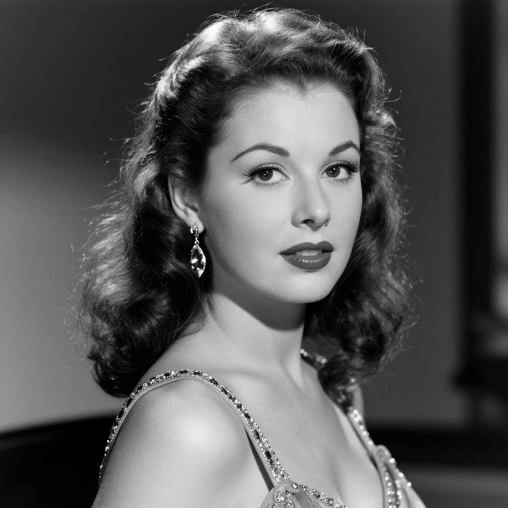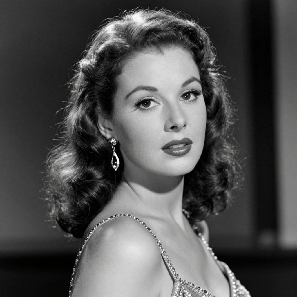 Hollywood glamour captured in a timeless black-and-white portrait featuring a woman with voluminous, wavy hair styled in a classic 1940s fashion, adorned with elegant dangling earrings and a sparkling, embellished dress strap, exuding vintage charm against a softly lit backdrop.