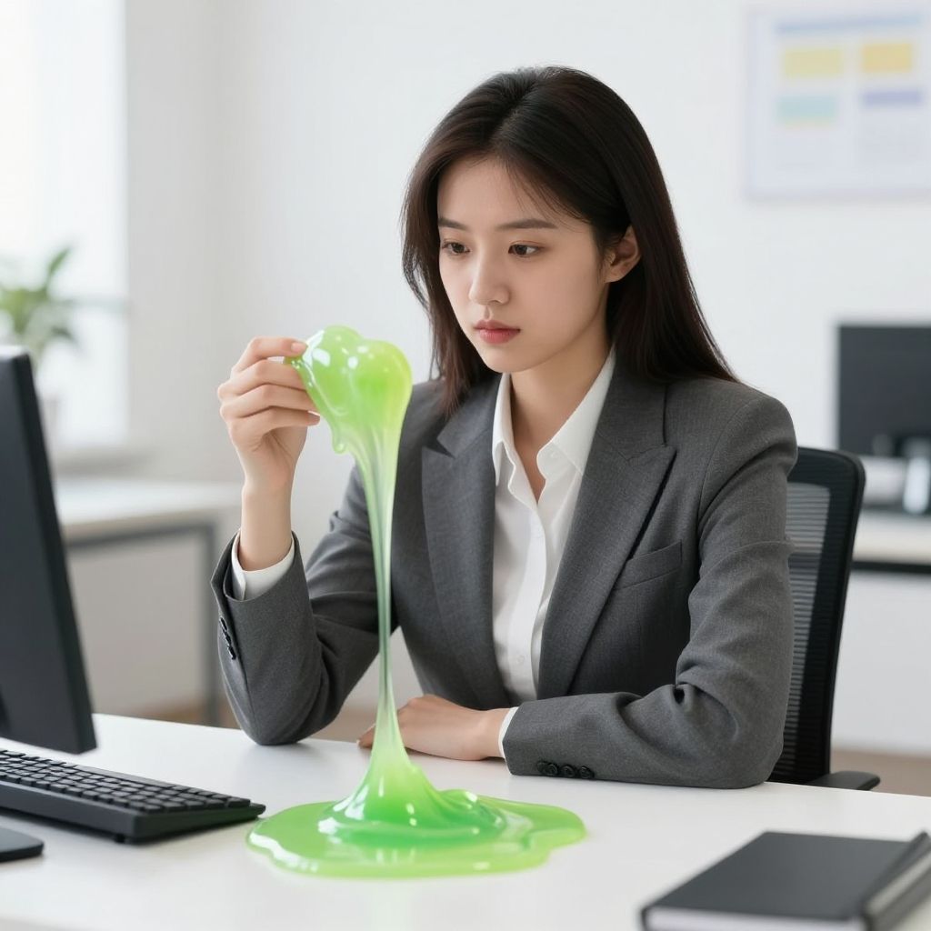 This is a digital anime-style illustration depicting a woman seated in an office chair. She wears a black blazer and a short black skirt, with her legs crossed at the knee. A green, translucent slime is dripping down her right thigh and onto the floor. The background includes a white desk and office chairs, with bright, even lighting suggesting an indoor office setting. The woman's skin is fair, and her legs are prominently displayed, showing smooth, unblemished skin. The chair is black with a cushioned seat. The overall scene is clean and modern, with a focus on the contrasting textures of the slime and her clothing.