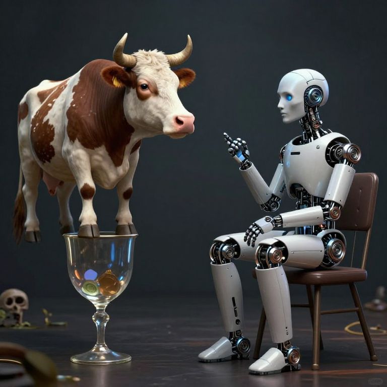 This digital CGI image depicts a surreal scene with a white and brown cow with horns standing on a large, transparent glass bowl, facing a humanoid robot seated on a brown chair. The robot, with a sleek white and black metallic body, has its right hand raised, pointing at the cow. The background is dark with a subtle gradient, and small skulls are scattered on the floor. The cow's expression is calm, while the robot's face is blank. The image combines elements of realism and fantasy, showcasing a striking contrast between organic and robotic forms.