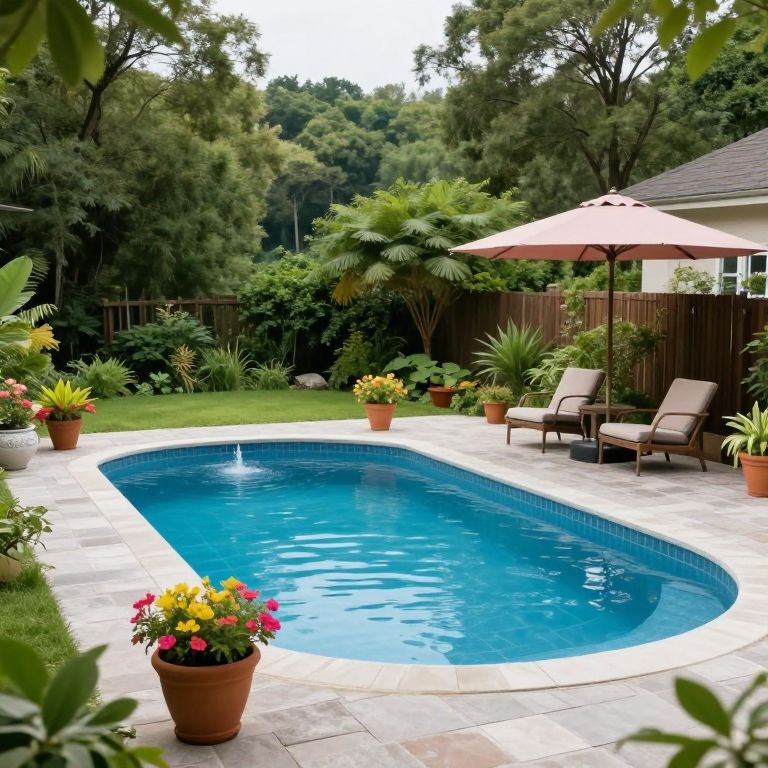 Photograph of a serene backyard pool with a curved blue design, surrounded by potted plants, lounge chairs, and a red umbrella. Lush green