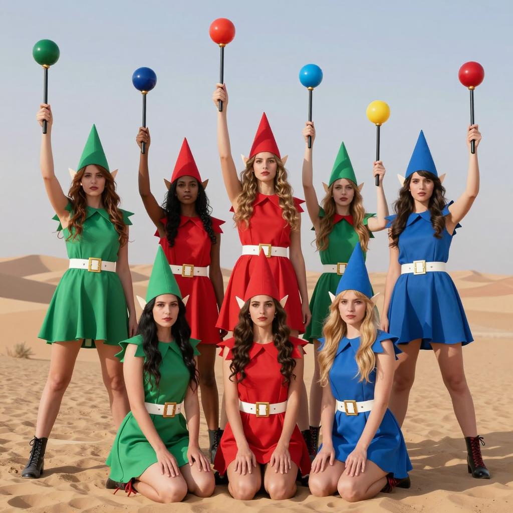 Group of 17 women in a desert landscape. Women wear colorful, short, V-neck tunics with belts and sandals. Most wear red, green, or blue. Some hold blue and orange hats with pointed tops. Women have long hair, sunglasses, and various expressions. Background includes rocky hills and sparse vegetation. Women walk in a loose formation, facing forward. Sunlight casts shadows on the ground.