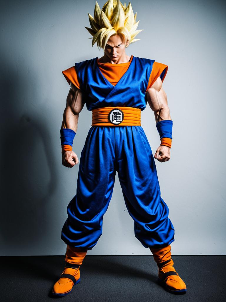 Man in Dragon Ball Super Saiyan costume, full-body cosplay photo, realistic tones