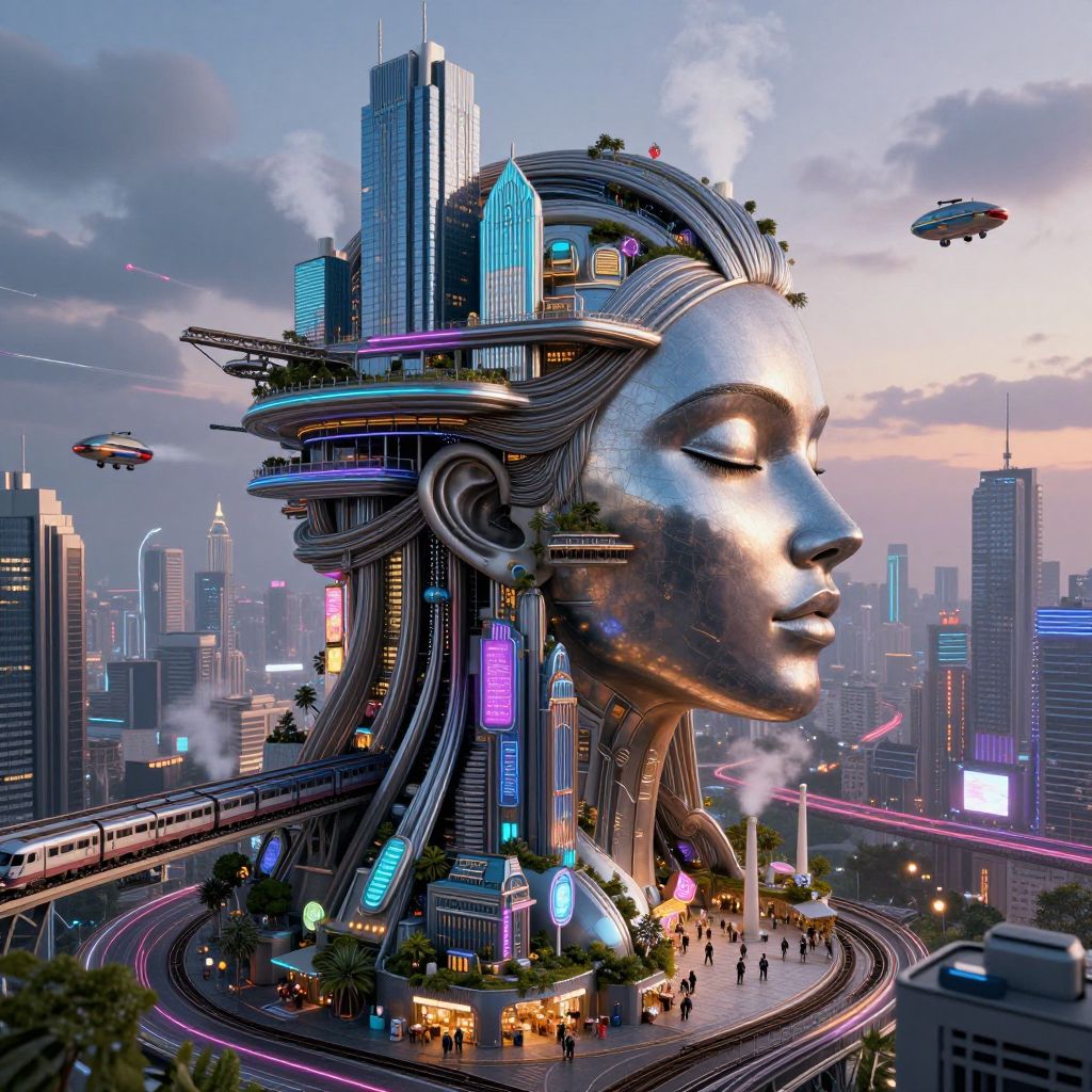 Cinematic, 9:16 shot.Dynamic view of an attractive 12m tall disturbing (smiling) female giant human head (and a young man in front of it) in Simon Stalenhag's style from a futuristic era, at dusk hour with very long and realistic projected shadows, detailed frame, painting looks to be life like, on the ground, magical multicolored ink, high quality, imagination, fantasy art, vivid magical colors, Many details everywhere. Ray-Tracing. Anti-Aliasing. Realistic reflections. Realistic soft shadows.Slightly desaturated colors. Insane quality. Insane resolution. Insane details. Masterpiece.Life-Like Photorealism. 16k resolutionBy Simon Stalenhag.