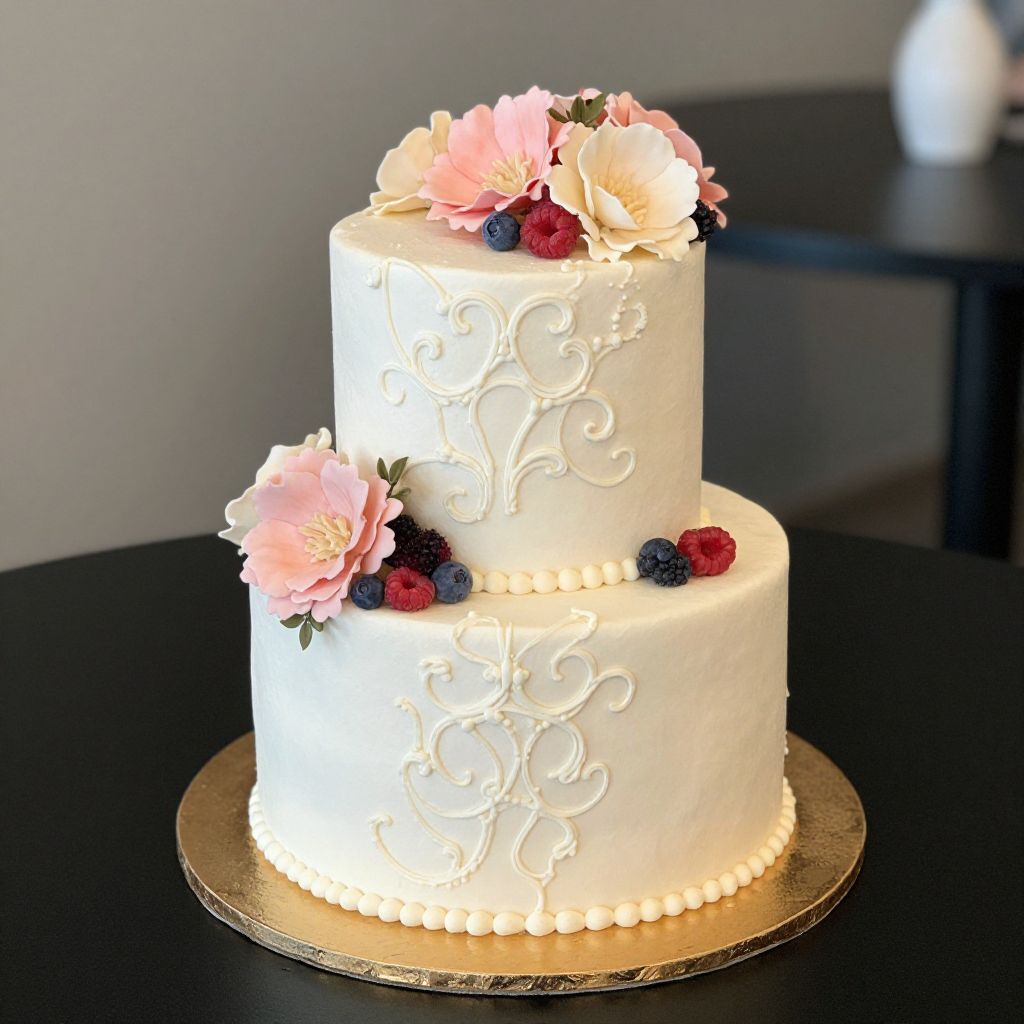 Photograph of a tiered cupcake stand with blue and white frosted cupcakes, floral arrangement, and blue-patterned plates on a white table.