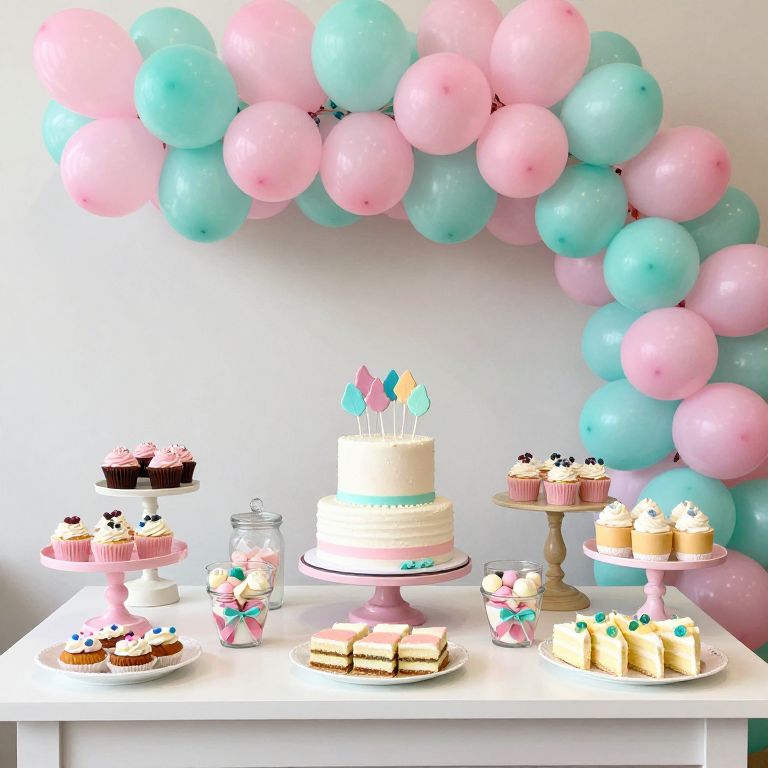 Elegant dessert table setup featuring a tiered display of colorful cupcakes, a basket of fresh flowers, and neatly arranged plates with blue and white patterns, set against a backdrop of black chairs and a white wall, evoking a festive \"Be Our Guest\" theme from Kara's Party Ideas.