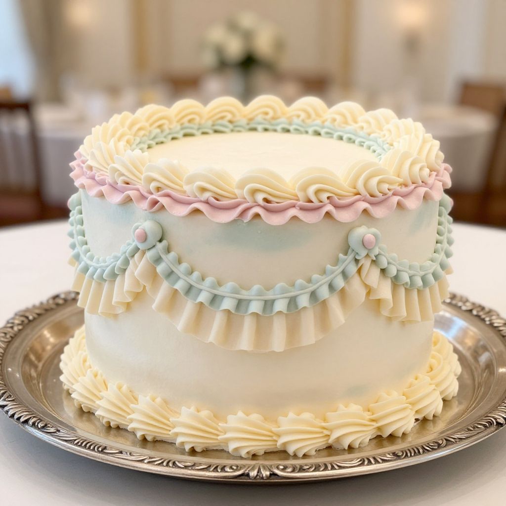 Photograph of a table set for a cupcake display. A three-tiered stand holds various cupcakes with blue, white, and yellow swirls, some with small decorations like blueberries. The table is covered with a white cloth. To the right, a wicker basket filled with pink and white roses and greenery. Black-and-white patterned plates with "Thank You" inscribed are stacked in front. Black wooden chairs with vertical slats are partially visible in the background. The overall style is elegant and charming, with a focus on pastel colors and delicate floral accents.