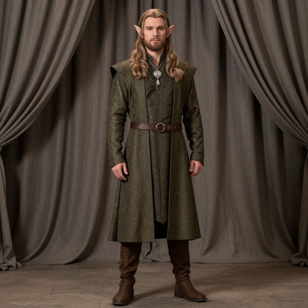Photograph of a tall, long-haired male elf with pointed ears, wearing a dark green, belted, medieval-style coat, brown boots, standing