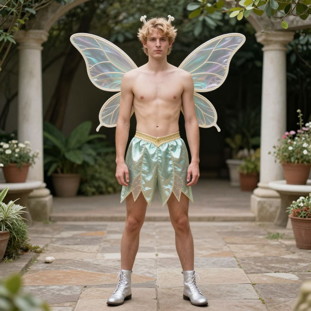 Male Fairy Outfit Costume, dressed in a fairy costume standing in a courtyard
