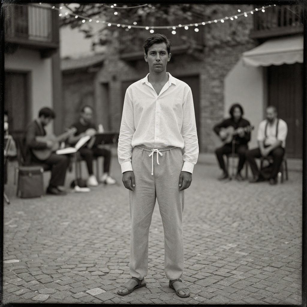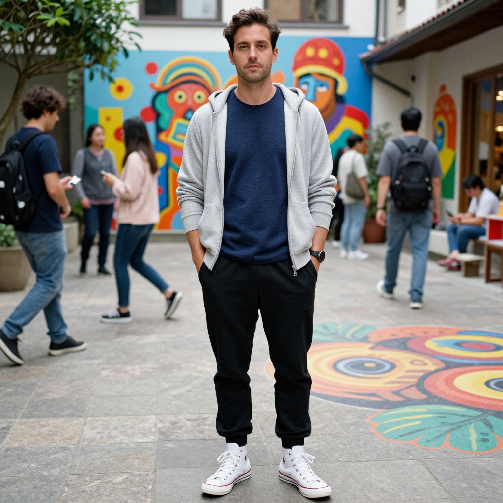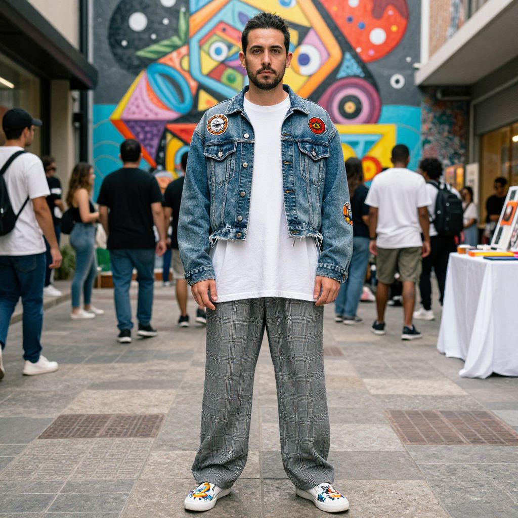 A man, layered long-sleeve shirt, relaxed-fit joggers, slip-on skate shoes, denim jacket, monochrome black and grey palette, colorful tents, handmade crafts, bustling crowds, camera obscura style, contemplative expression. Man has masculine face and piercing eyes