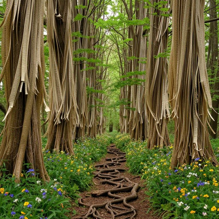A mystical woodland where towering trees stand cloaked in cascading strips of parchment-like bark, their roots entwined with a meandering path lined by vibrant wildflowers, inviting whispers of untold stories.