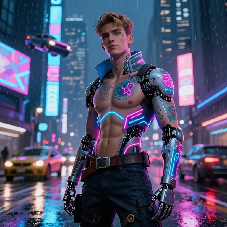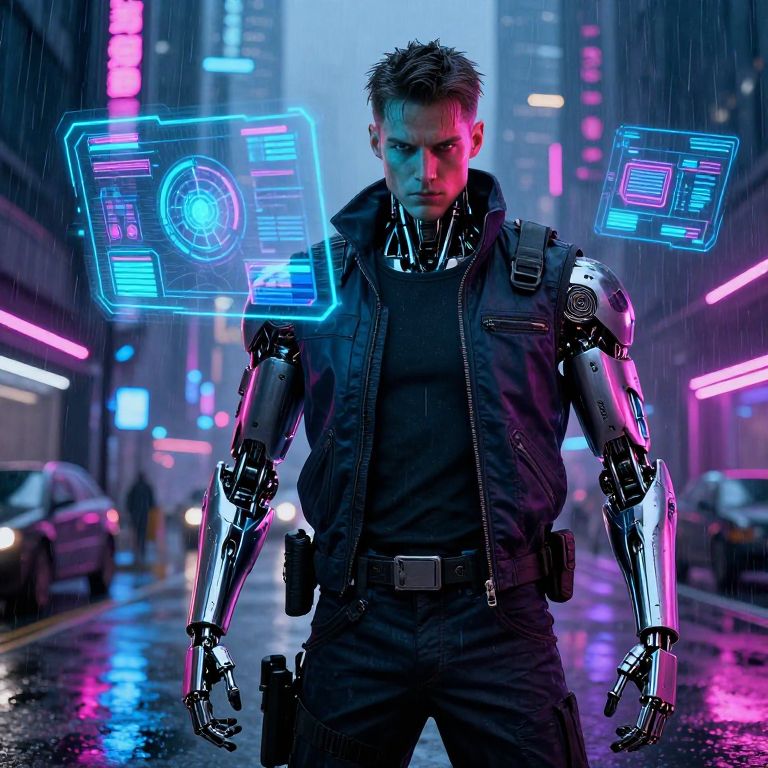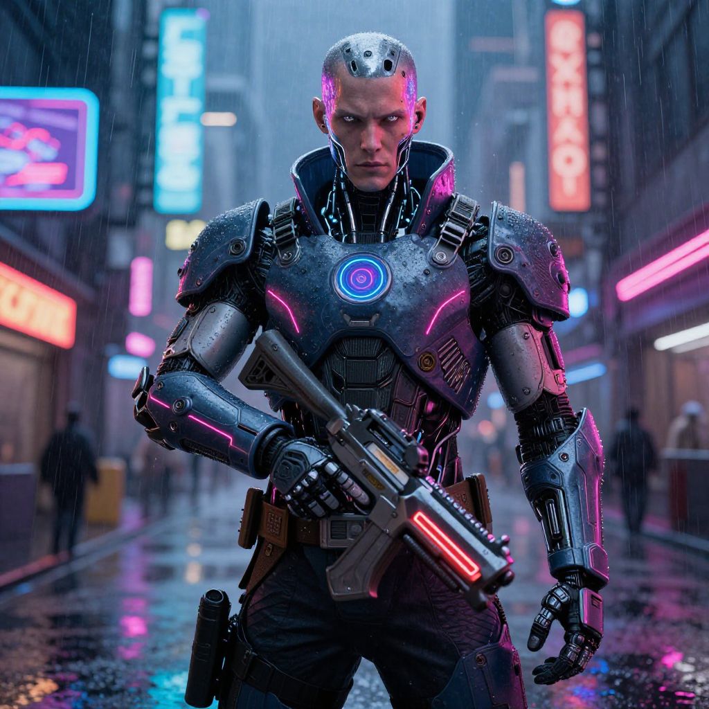 Skinny bald guy wearing futuristic armor, neon cyberpunk cityscape, rain-soaked streets, intense expression, high contrast colors, sci-fi aesthetic