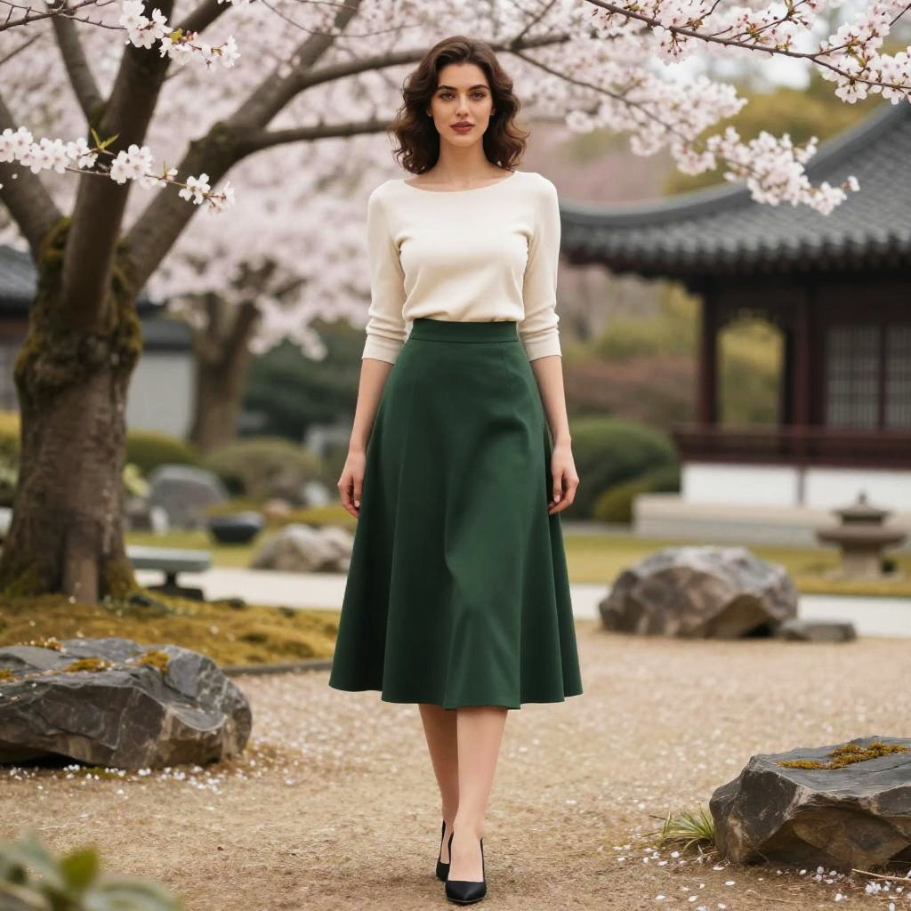 A woman, styled in a production ig visual aesthetic, wearing a mint green crochet knit top with long sleeves and a solid black relaxed-fit mini skirt, accessorized with a black cuff bracelet, minimal makeup, and a simple hairstyle, standing in a flower garden with a colorful trellis. Sexy. Pretty face and beutiful eyes