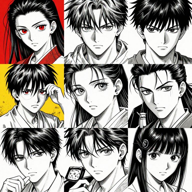 Digital manga-style collage of nine black-and-white anime characters with varied expressions, red, yellow, and white backgrounds, and intense gazes.
