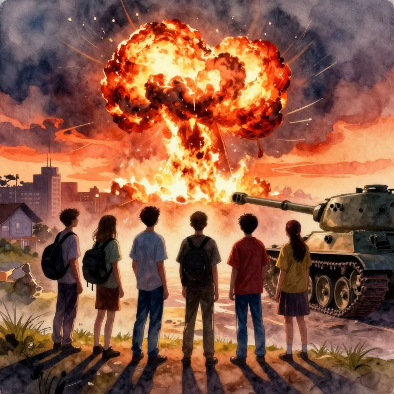 In this dramatic and evocative scene, a group of five teenagers stands on a hill overlooking a suburban city, their silhouettes outlined against the vibrant sunset sky. The atomic nuclear explosion in the background casts a dramatic, fiery glow, creating a stark contrast with the warm hues of the setting sun. The teenagers, dressed in casual attire, are positioned in a line, their attention captivated by the unfolding disaster. To the right, a large, old-fashioned tank is visible, adding a sense of historical context and tension to the scene. The composition is masterfully crafted, adhering to the rule of thirds, with the explosion and the tank serving as powerful focal points. The watercolor style and sketched outlines give the image a painterly, almost dreamlike quality, while the detailed, cinematic lighting and volumetric lighting enhance the depth and atmosphere. The overall effect is both haunting and thought-provoking, capturing a moment of awe and contemplation in the face of a catastrophic event.