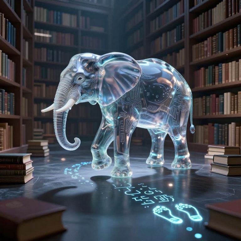 In a surreal, cyberpunk-inspired library filled with floating books, a translucent elephant crafted from liquid glass glides gracefully, casting ethereal shadows and leaving behind illuminated footprints that spell out forgotten languages in a mesmerizing display of digital artistry.