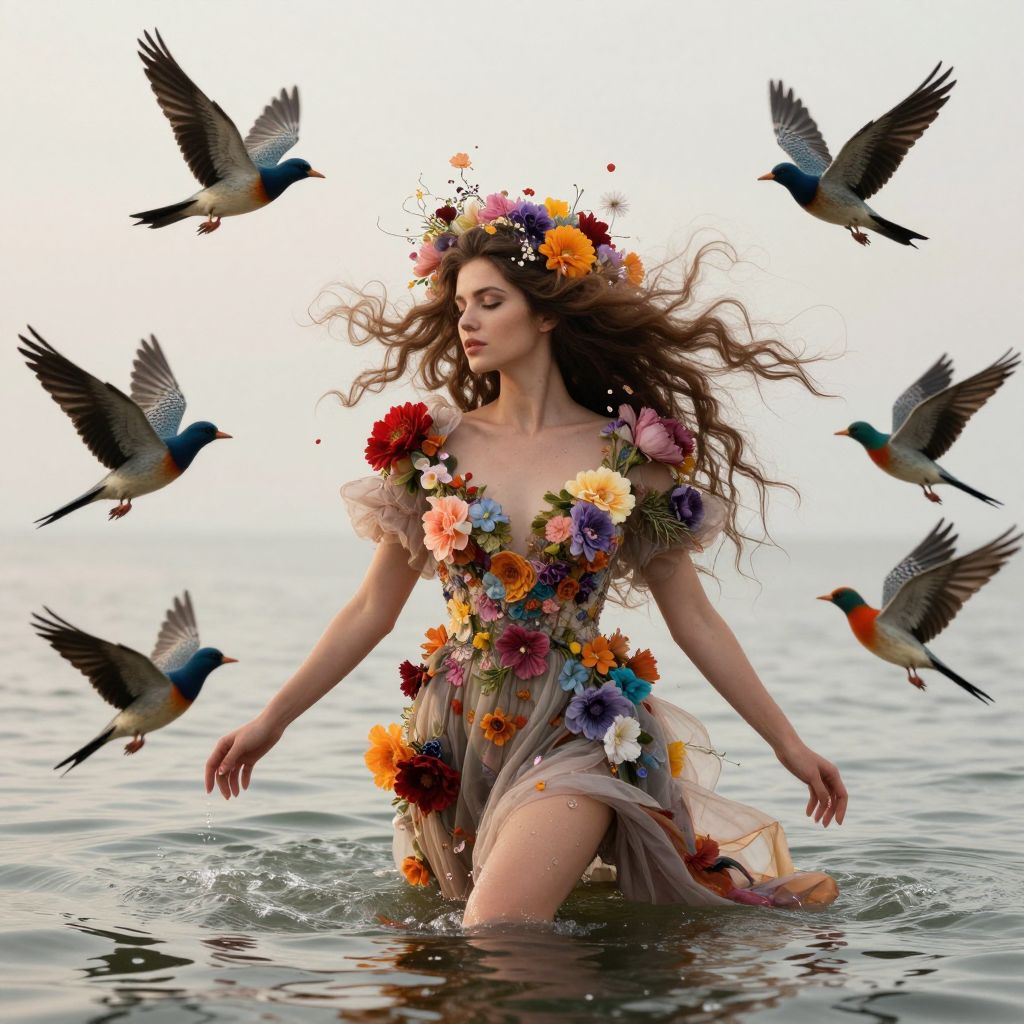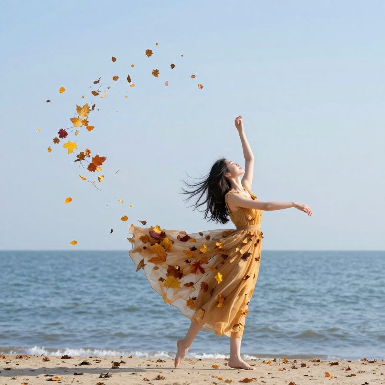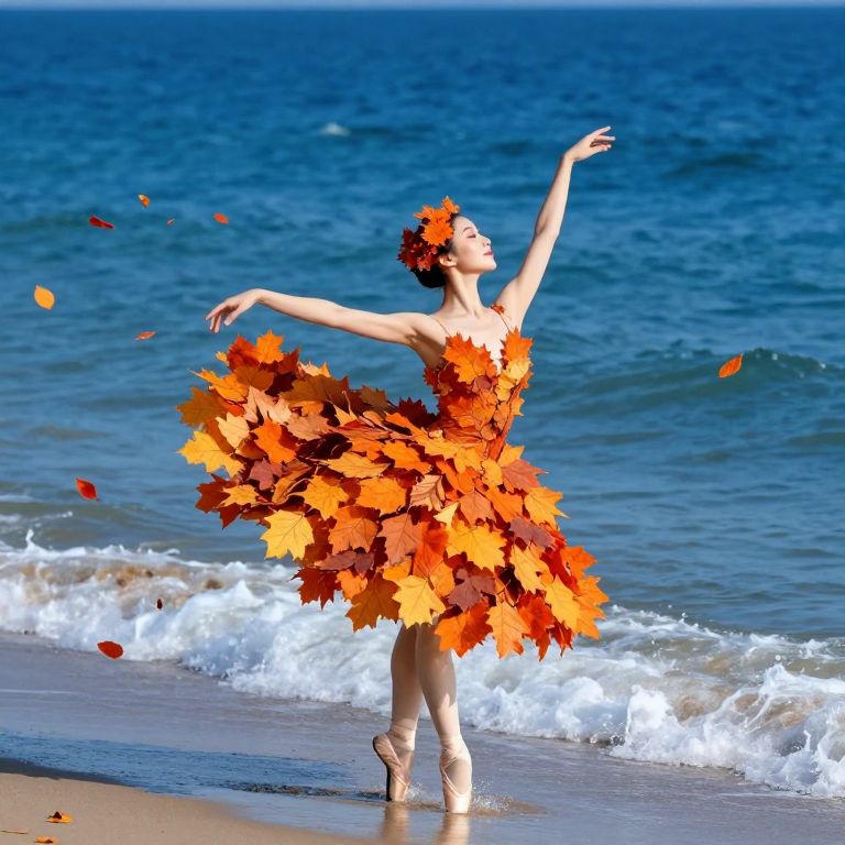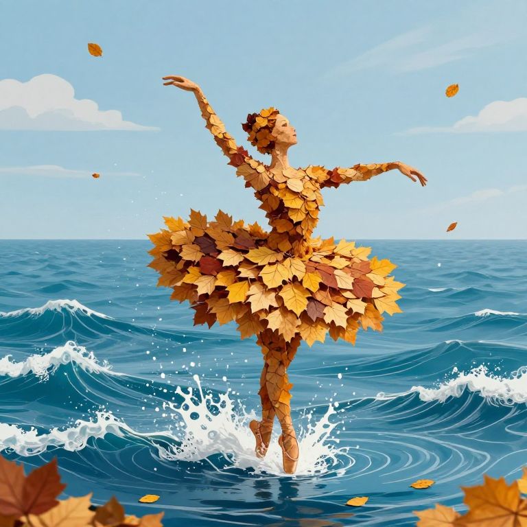 A colossal ballerina made entirely of autumn leaves pirouettes across the tides of a sapphire sea, creating seasonal tempests in her wake.