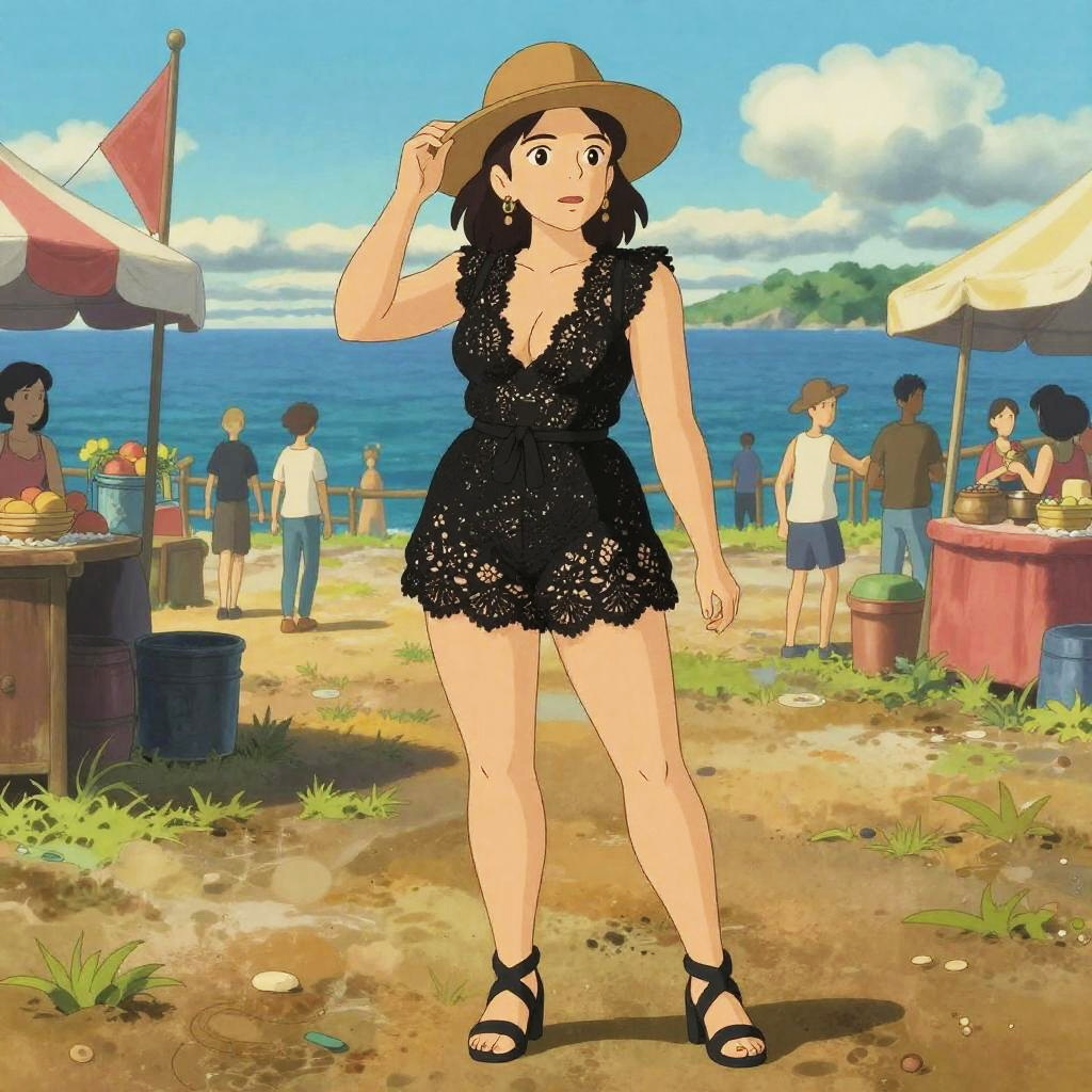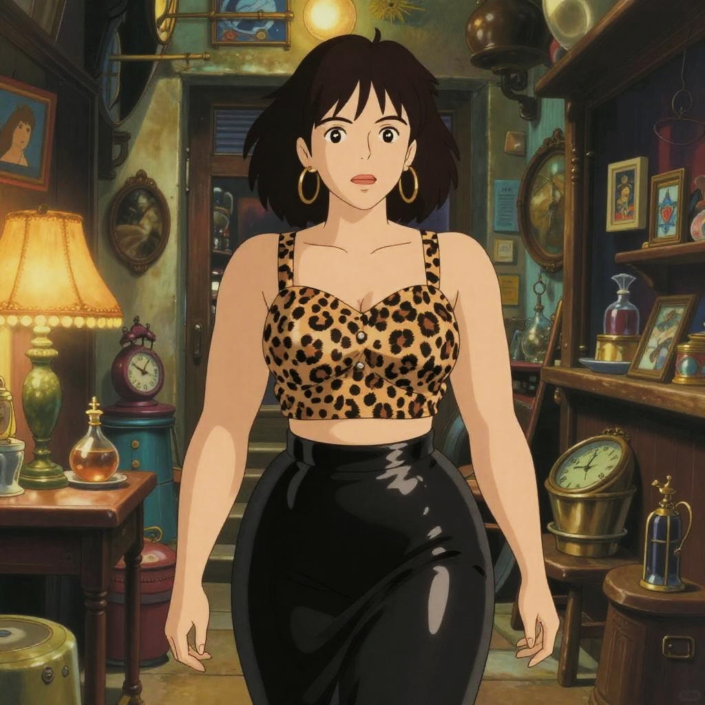A Busty woman in casual streetwear, oversized denim jacket, white crop top, and camo print high-waisted shorts, large silver hoop earrings, wavy long hair, enjoying a vibrant puppet show in a historic town hall, in the whimsical style of Studio Ghibli. Sexy. Pretty face and beutiful eyes