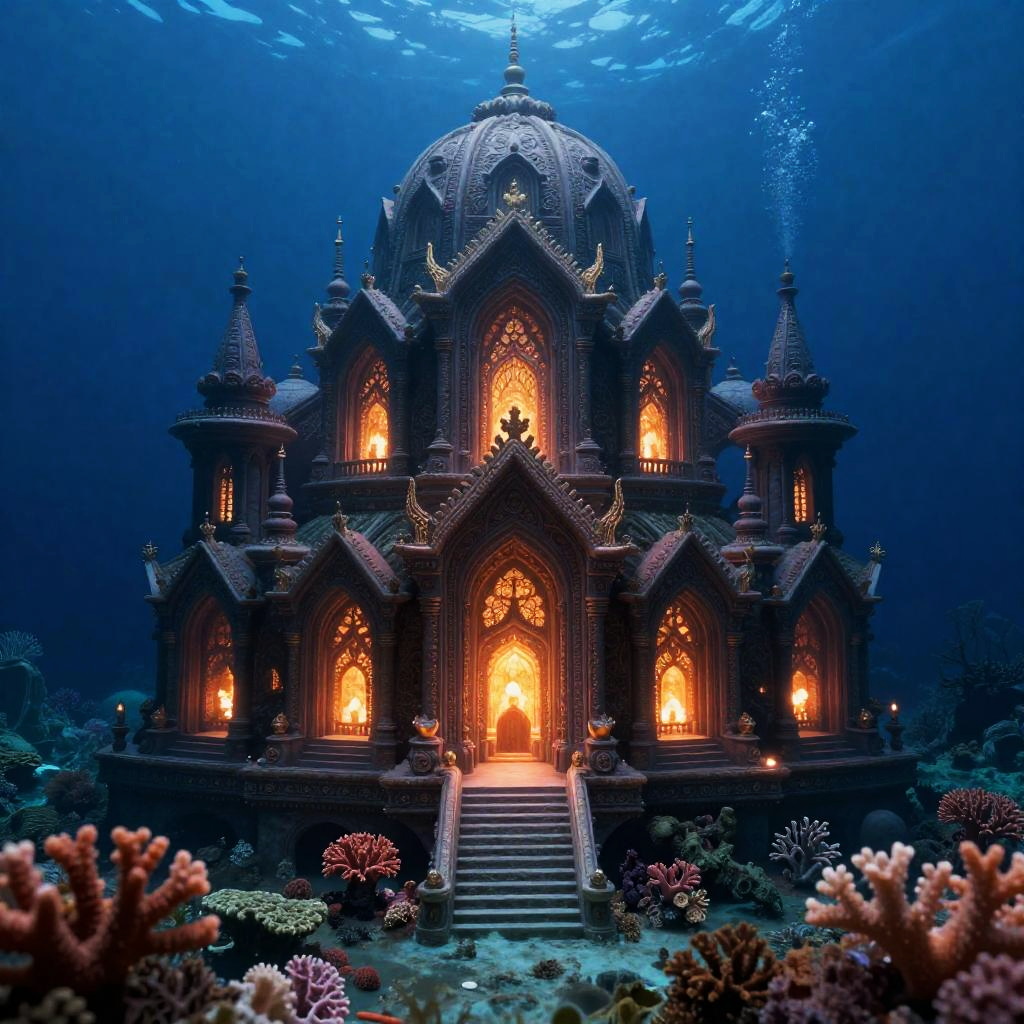 A bioluminescent coral cathedral set in a submerged alien reef, inspired by Zdzisław Beksiński. This artwork emphasizes intricate details and is rendered in stunning 8k resolution, showcasing vibrant colors and a captivating atmosphere.
