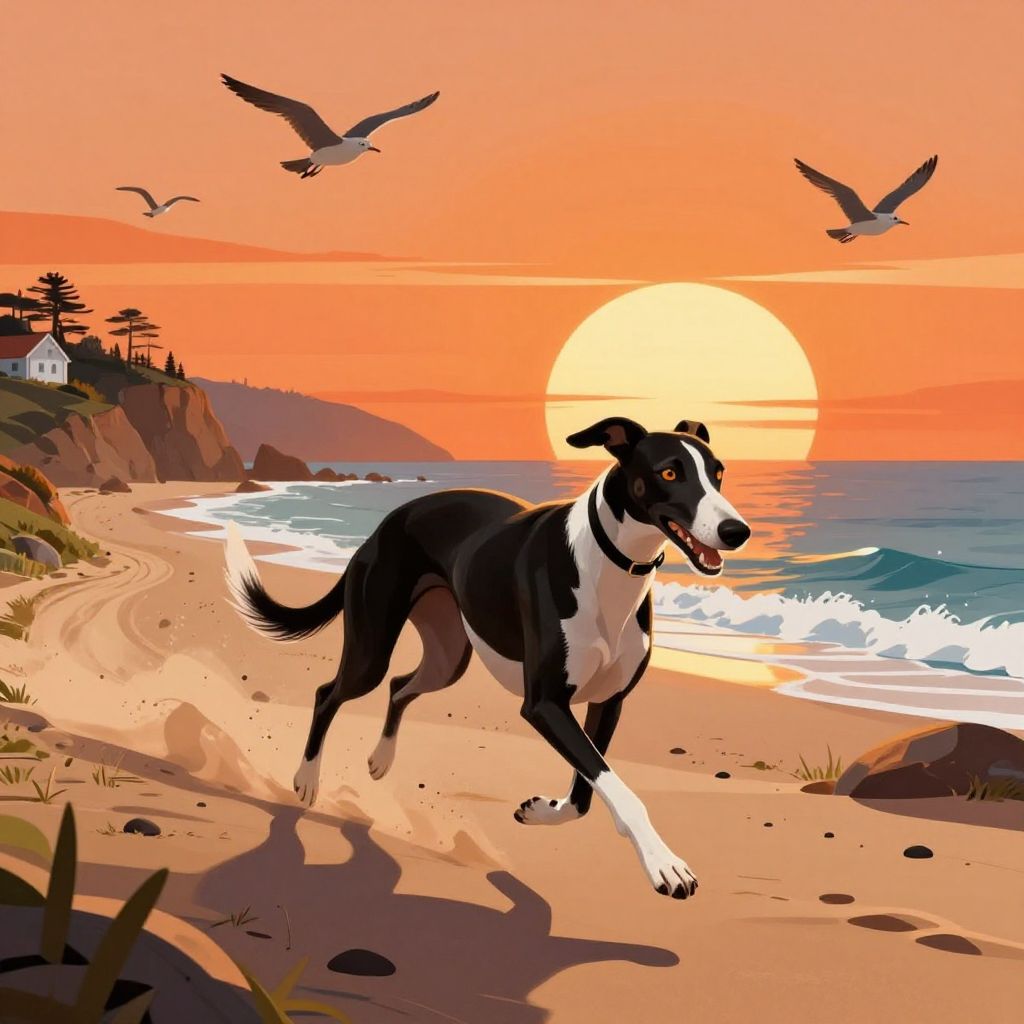 Dynamic illustration of a sleek black and white greyhound dog sprinting along a sandy coastal trail during a dramatic sunset. Background features a glowing sun setting over the ocean with waves gently crashing on the shore. Coastal cliffs and small houses dot the landscape, while birds soar in the vivid orange sky, capturing the intense energy and speed of the animal in motion.