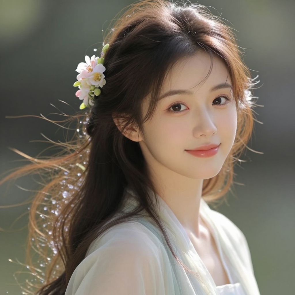 An Asian girl with long, flowing braids that cascade down her back, wearing a delicate floral crown made of soft pink and white cherry blossom petals. She has warm brown eyes that sparkle with gentle warmth, a soft, natural smile, and sun-kissed skin that glows under the morning light. She stands in a serene forest clearing, surrounded by blooming cherry blossoms that drift gently in a soft breeze, their petals swirling like a quiet dance. The scene is illuminated by golden morning sunlight filtering through the trees, casting dappled shadows and creating a dreamy, magical atmosphere. The overall mood is peaceful, inviting, and full of quiet beauty, as if the forest itself is breathing with her presence.