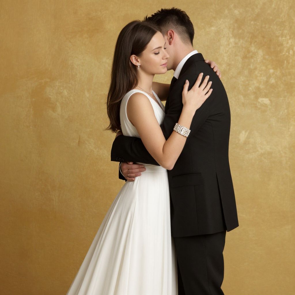 Elegantly dressed couple embracing tenderly, with the woman in a flowing white gown adorned with a sparkling bracelet and the man in a sleek black suit, set against a warm, textured golden backdrop.