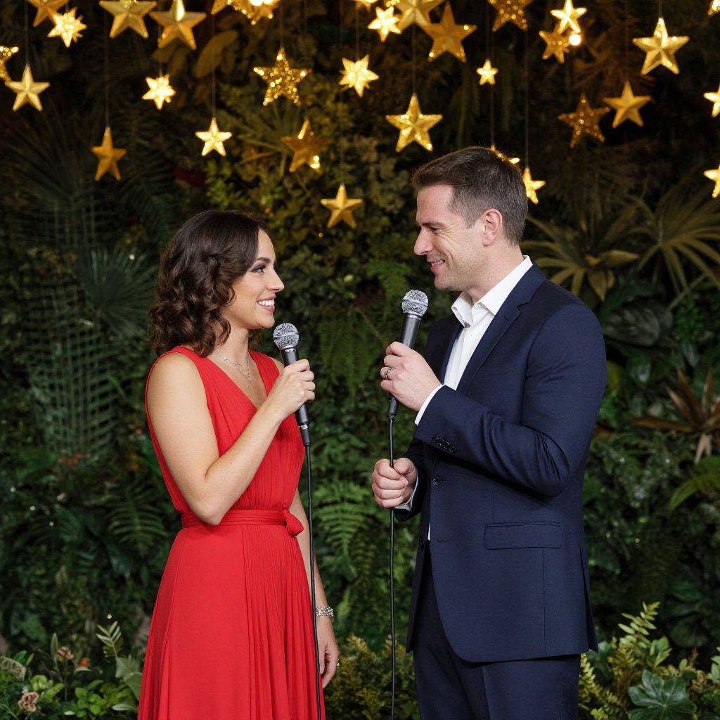 Photograph of a smiling man in a black suit and a woman in a red dress, holding microphones, against a starlit, green foliage backdrop