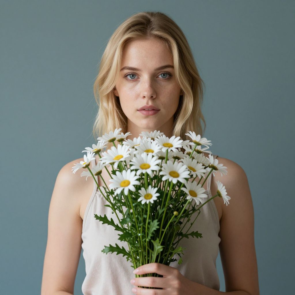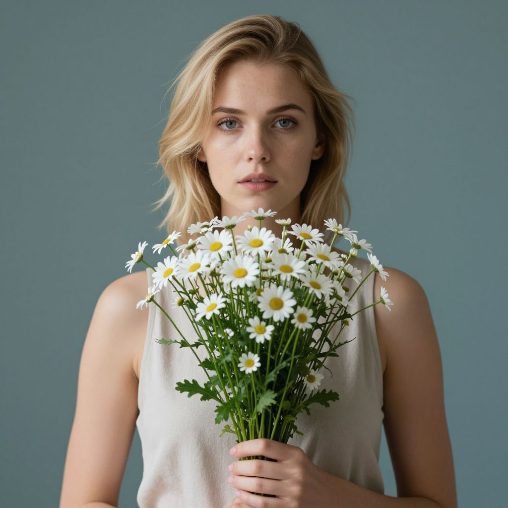 Blonde-haired woman holding a bouquet of delicate white daisies with green stems, her gaze directed forward against a muted teal background.