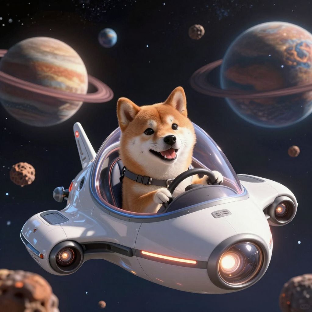Digital art of a cute, orange Shiba Inu driving a futuristic white spaceship through a starry, planetary-filled space. The dog wears a harness