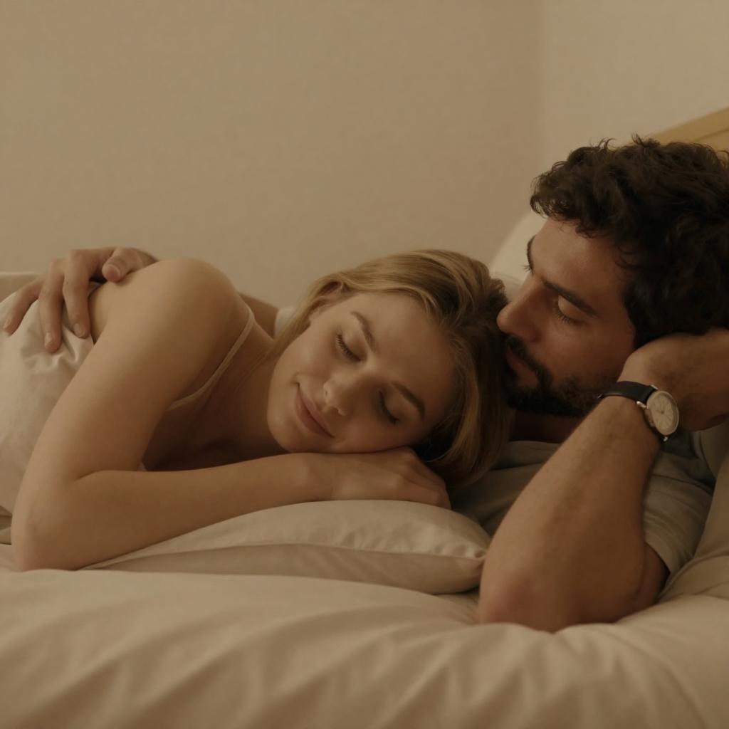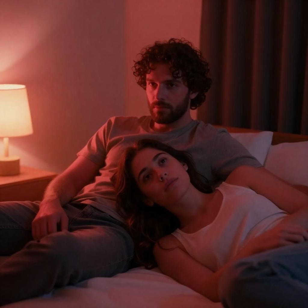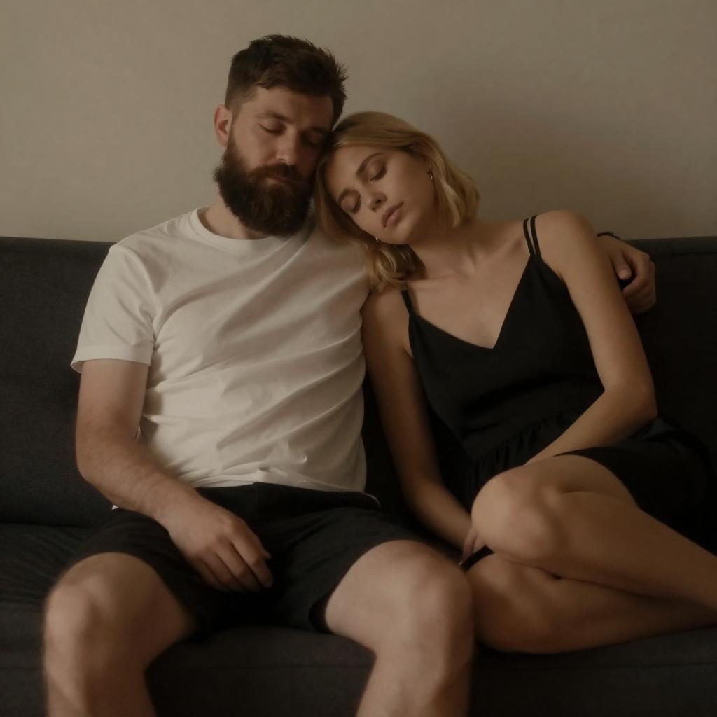 Photograph of a bearded man with short dark hair in a white t-shirt and black shorts, sitting on a dark couch. A blonde woman with a bob haircut in a black dress leans her head on his shoulder, eyes closed. Warm, dim lighting casts a soft glow on their relaxed, intimate pose.