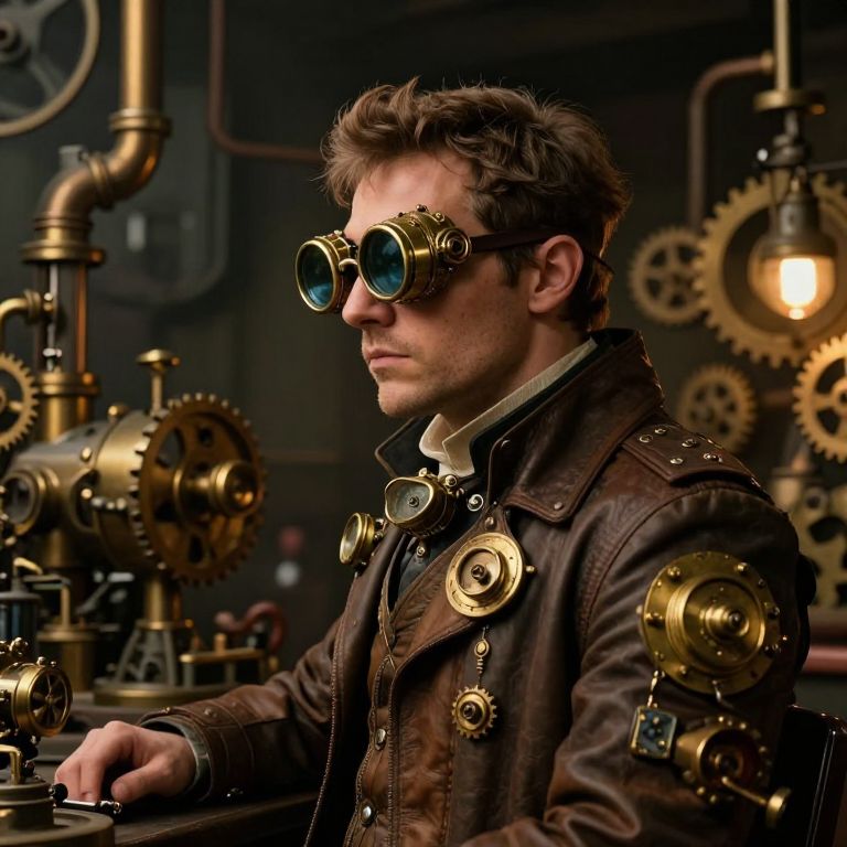 Steampunk male inventor with goggles, brown leather jacket, and brass gears, working in a dimly lit, industrial workshop. Digital art.
