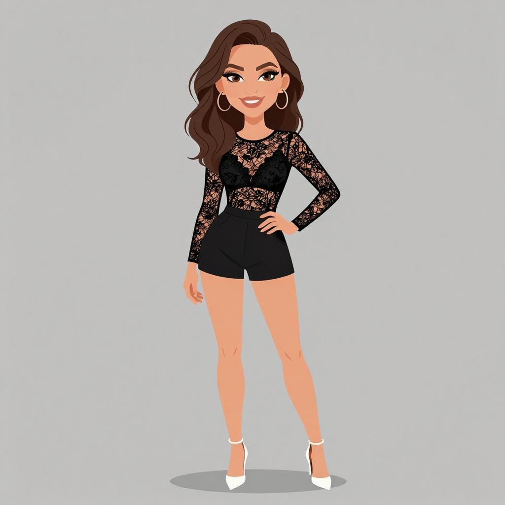 Woman with pretty face and pretty hair. smiling Woman, modern with a vintage twist, cropped brocade top in dark hues with intricate pattern, high-waisted flared shorts matching the top, sheer black tights with polka dot embellishments, chunky platform heels in black, beret cap tilted to one side, minimalist metallic clutch, visible tattoos, white studio background. --sref 1467