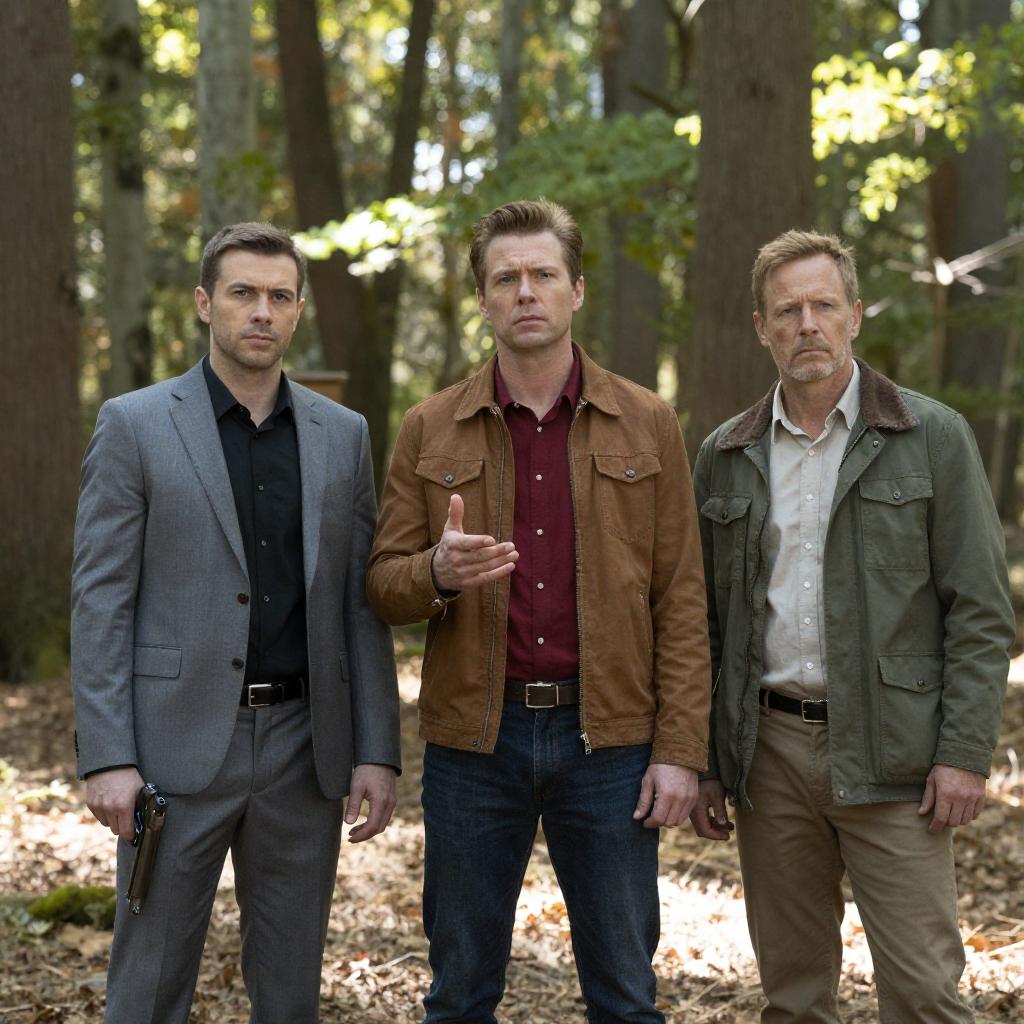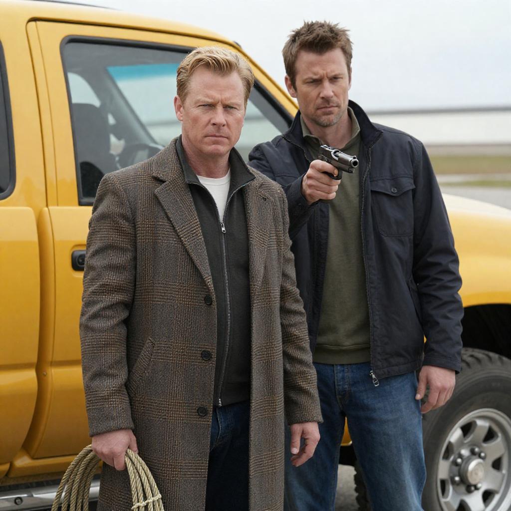Photograph of a man with short blonde hair, wearing a black jacket, blue shirt, and gray pants, with a blue glove on his right hand. Behind him, a police officer with short gray hair, wearing a beige uniform with a badge, stands with his arms crossed. They are in front of a blue car with green foliage in the background. The man looks to the left, while the police officer looks at the man.