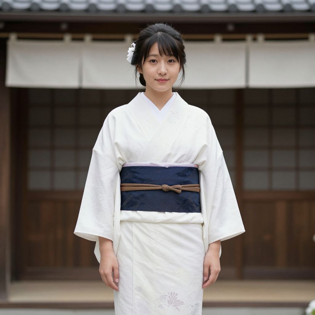 Photograph of a young Japanese woman in a white kimono with a black obi, standing in front of a traditional wooden building. Black hair,
