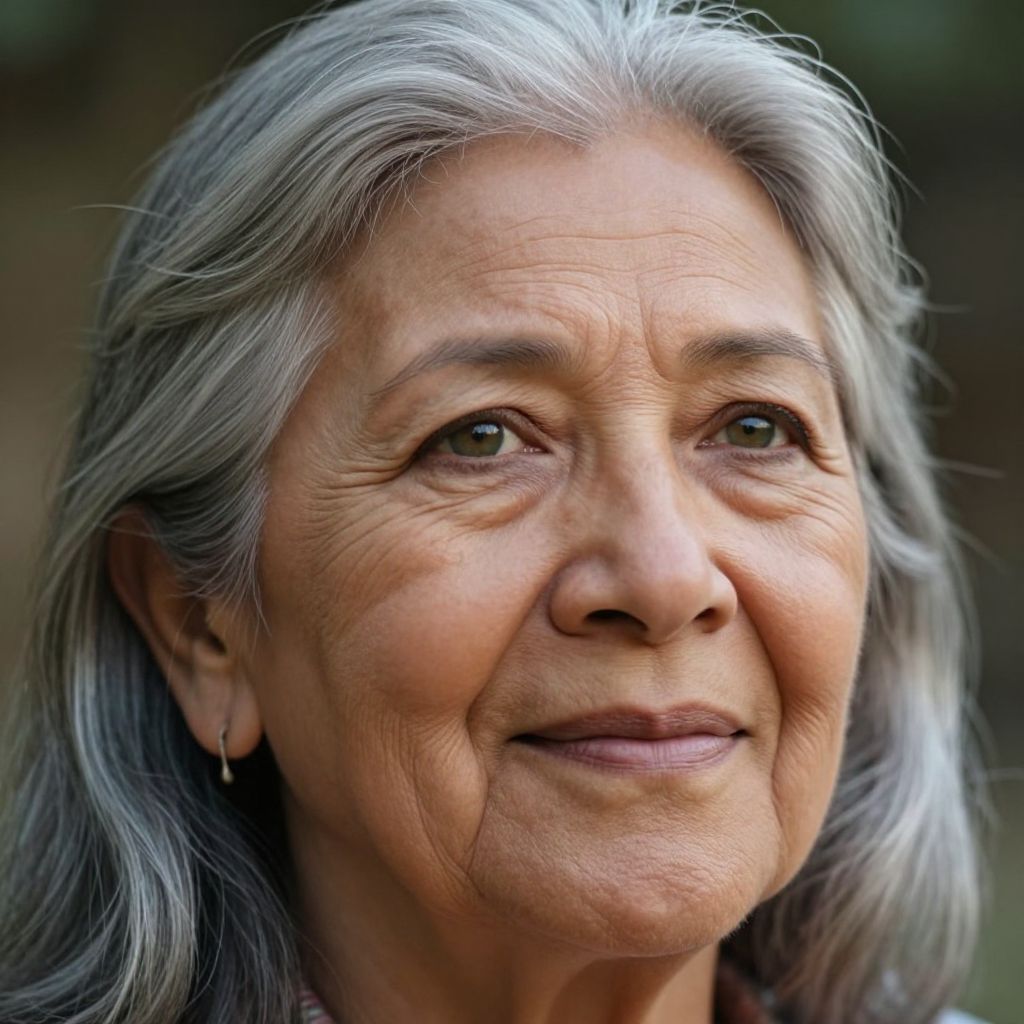 Create a hyperrealistic digital art portrait, focusing on an older Latin American woman with an expressive face. Capture the close-up with deep laugh lines framing her face and captivating green eyes, gazing thoughtfully, conveying a sense of poignant reflection. Her silver-streaked hair, soft and wavy, gracefully frames her face, accentuating the subtle gray wisps at her temples. The gentle creases on her cheeks and the delicate crinkles around her eyes tell a story of a life filled with warmth, wisdom, and joy. This detailed rendering aims to celebrate the beauty of aging, showcasing the resilient strength of her spirit and the complex tapestry of human emotions in a single, mesmerizing image.